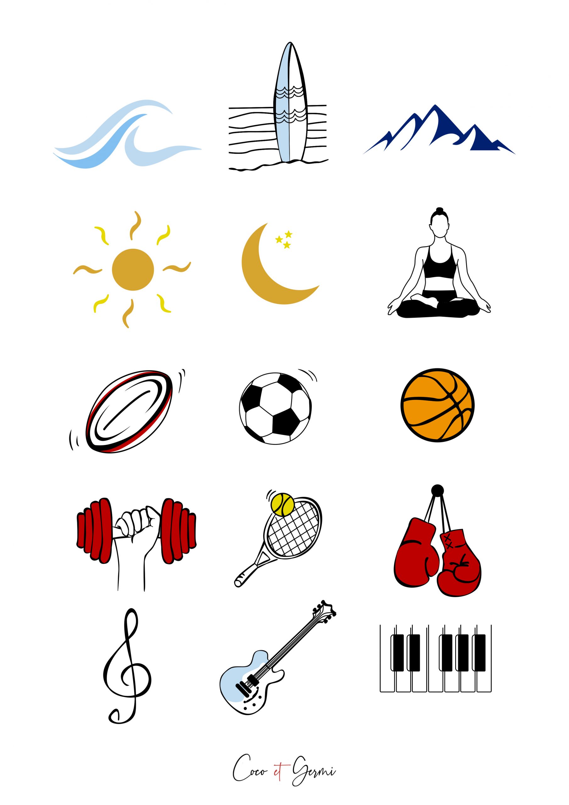 🌊 La mer / L’océan – 🏄 Planche de surf – 🏔️ Montagnes – ☀️ Soleil – 🌙 Lune – 🧘 Yoga – 🏉 Rugby – ⚽ Foot – 🏀 Basket – 🏋️ Muscu – 🎾 Tennis – 🥊 Boxe – 🎼 Clé de sol – 🎸 Guitare – 🎹 Piano